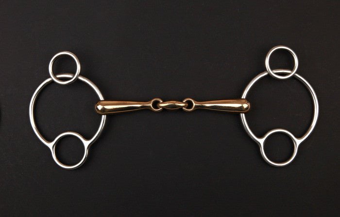 Enabling a soft contact but with extreme control. Popular bit with the show jumpers, as it offers varying effects of leverage, depending on how your horse is feeling or travelling as to whether the rider chooses in increase or decrease leverage. This is done by altering the position on the rings. Reins on middle ring offers mild, to reins on Pelham keepers (leather rounding that loops from middle ring to lower ring) for medium leverage and reins of bottom rings for extra leverage. Great to get horses travelling more on their haunches and offers assistance to rider for preparedness in the jumping ring. This bit is also great on the turning aids so gel bit guards may add some extra comfort to the mouth.