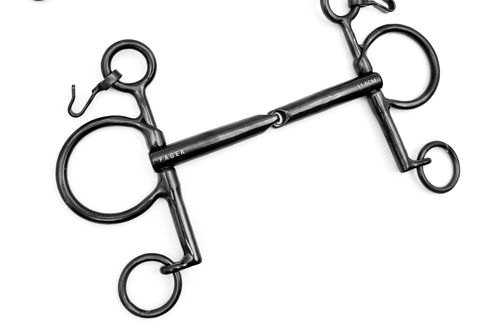 Fager recommend using the Baby pelham with a delta bridle or two reins, one in the large fixed ring and one in the small ring.
