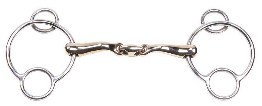 This is a popular bit in showjumping. It offers a mild gag action, while the curved mouthpiece and ring design gives clear turning aids. The top (bridle cheek) rings are very cleverly angled in order to avoid excessive cheek pressure.