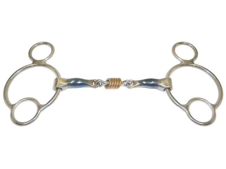 The Colin Miles is a great schooling bit with a wide center piece creating greater tongue pressure and reducing bar pressure. The rings give the horse something to play with and help keep the horses attention on the bit.