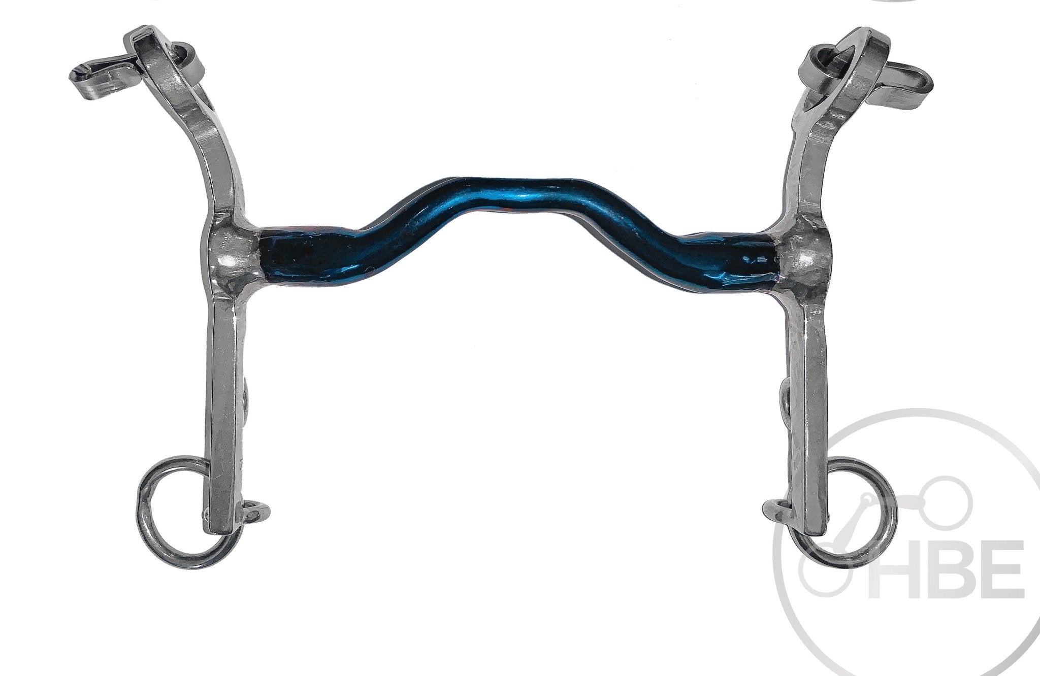 The Weymouth works on several parts of a horse's head and mouth. The bit mouthpiece acts on the bars, tongue and roof of the mouth. The shanks add leverage and place pressure on the poll via the crownpiece of the bridle, to the chin groove via the curb chain, and, especially with a "loose jaw" shank, may act on the sides of the mouth and jaw. This mouthpiece is curved and softer than another Bombers Weymouth style called Happy Tongue Straight.