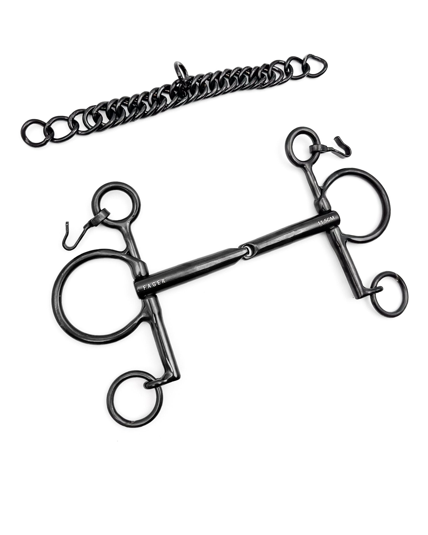 Fager recommend using the Baby pelham with a delta bridle or two reins, one in the large fixed ring and one in the small ring.