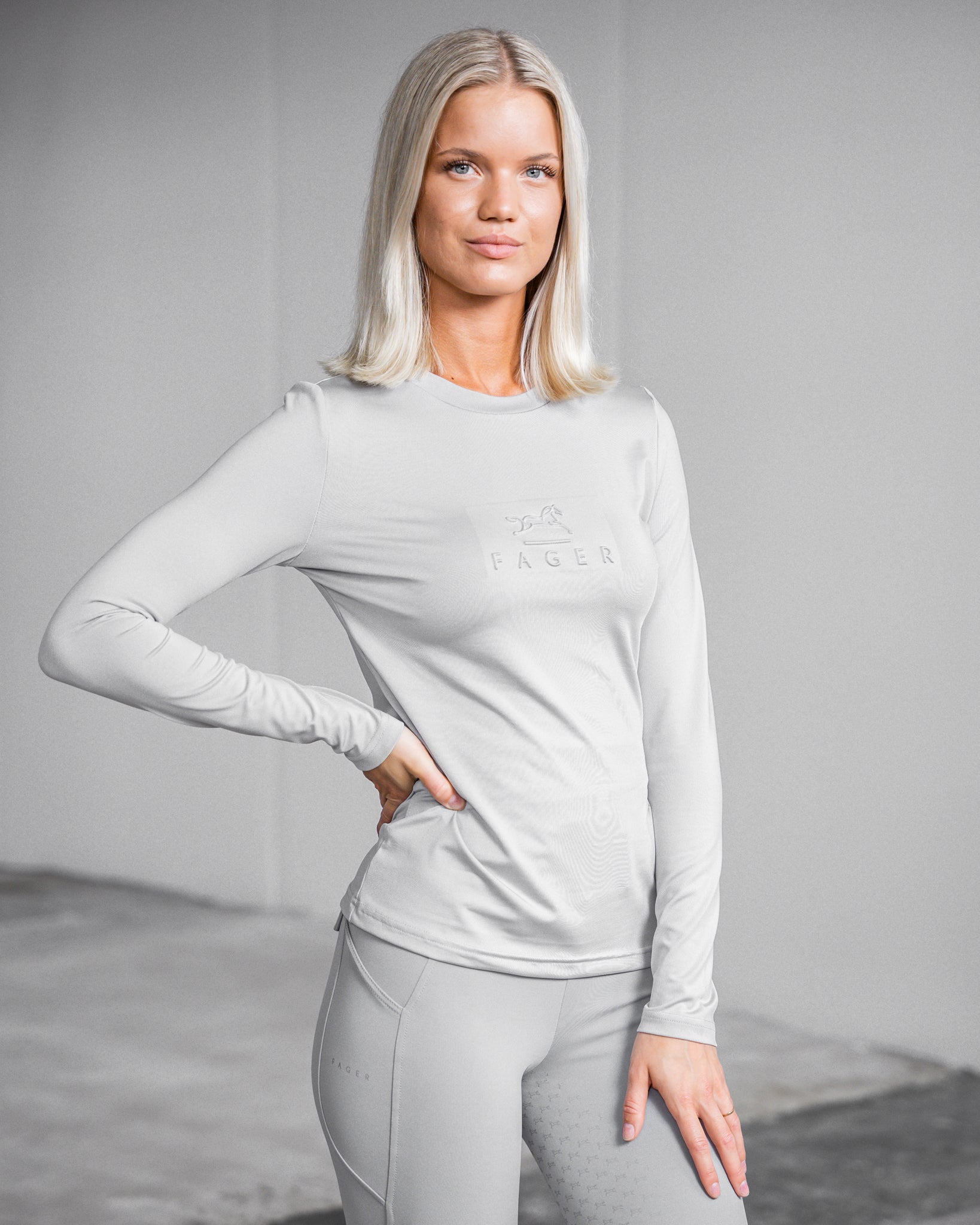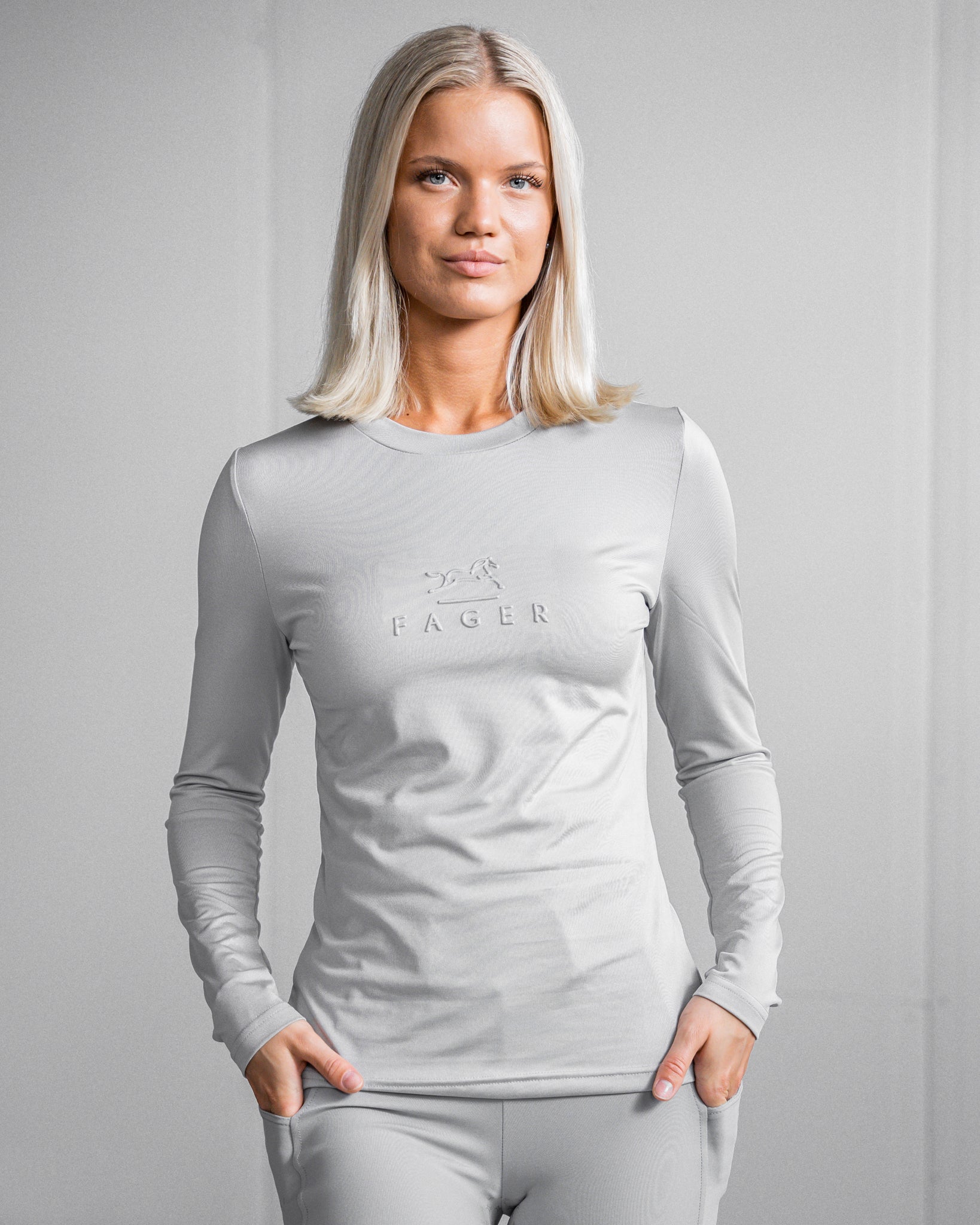 The Fager Ida Long Sleeve T-Shirt in Light Grey is the perfect equestrian clothing for everyday wear and workouts. Crafted from a breathable polyester spandex blend, this t-shirt features 4-way stretch to provide free movement and comfort. An embossed logo on the chest adds a stylish touch. Perfect for everyday wear or for workouts, this long sleeve t-shirt is true to size for a loose fit, or size down for a closer fit.
